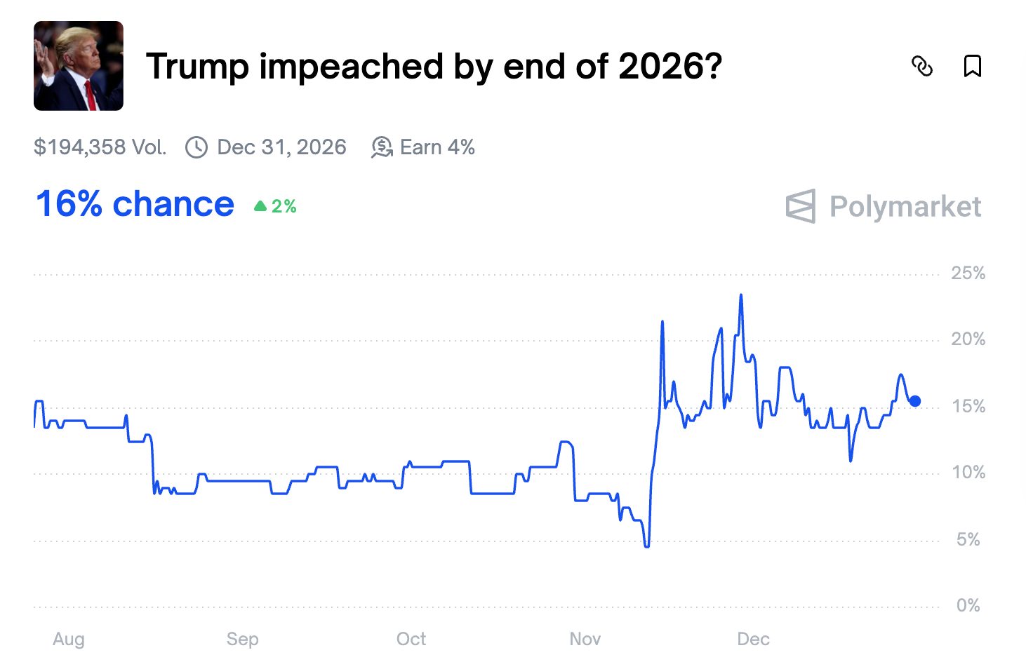 The probability that Donald Trump is impeached by the end of 2026 currently stands at just 16%. With the results of next year’s midterm elections not set to take effect until 2027, those odds appear justified, even in the event of a Democratic sweep.