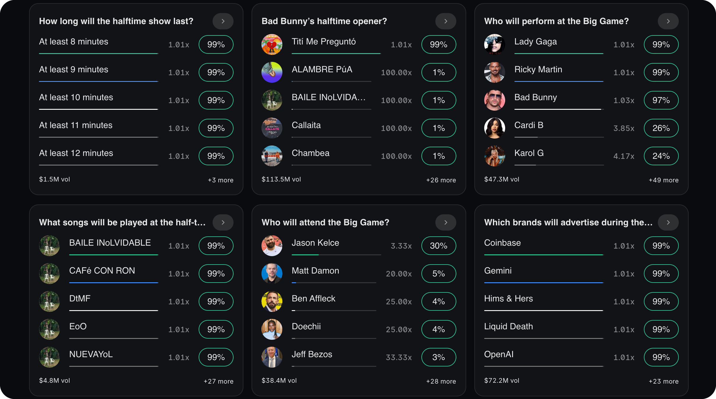 Where Polymarket did stand out, though, was its main use case — information discovery. Its halftime performer market had Lady Gaga sitting at roughly 80% for days leading up to the game — well before her surprise appearance during the halftime show, which Billboard had no prior reporting on and which genuinely caught everyone I was watching with off guard.