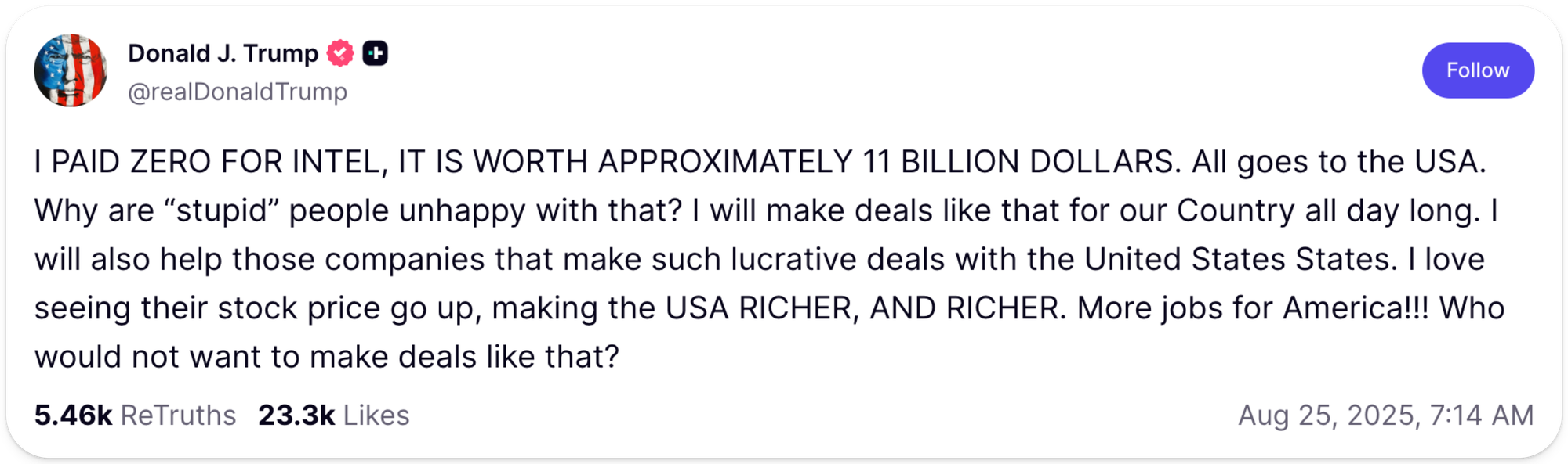 The Intel acquisition was “funded” by a Biden-era CHIPS Act grant, and while the funds disbursed by this program certainly cost taxpayers, the money was always intended to be spent on semiconductor R&D, meaning the government’s INTC equity interest is technically free.