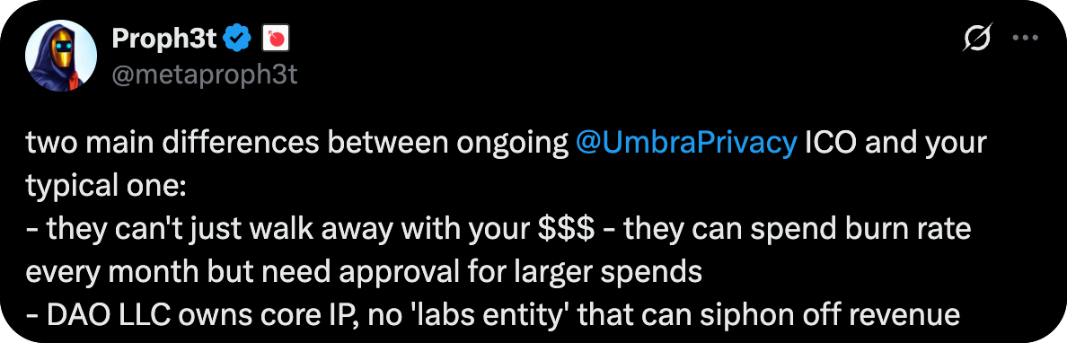 - Real Ownership: Token holders control the IP, treasury, and key decisions through programmable smart contracts. They can propose anything — team salaries, strategic pivots, full treasury liquidations. For example, if a founder slacks off, holders can push through a refund proposal that passes if the market agrees it's the smart move. This solves what Felipe from Theia Research calls the "Tokenholder Rights Problem" — letting holders get their money back if the founder stops working.