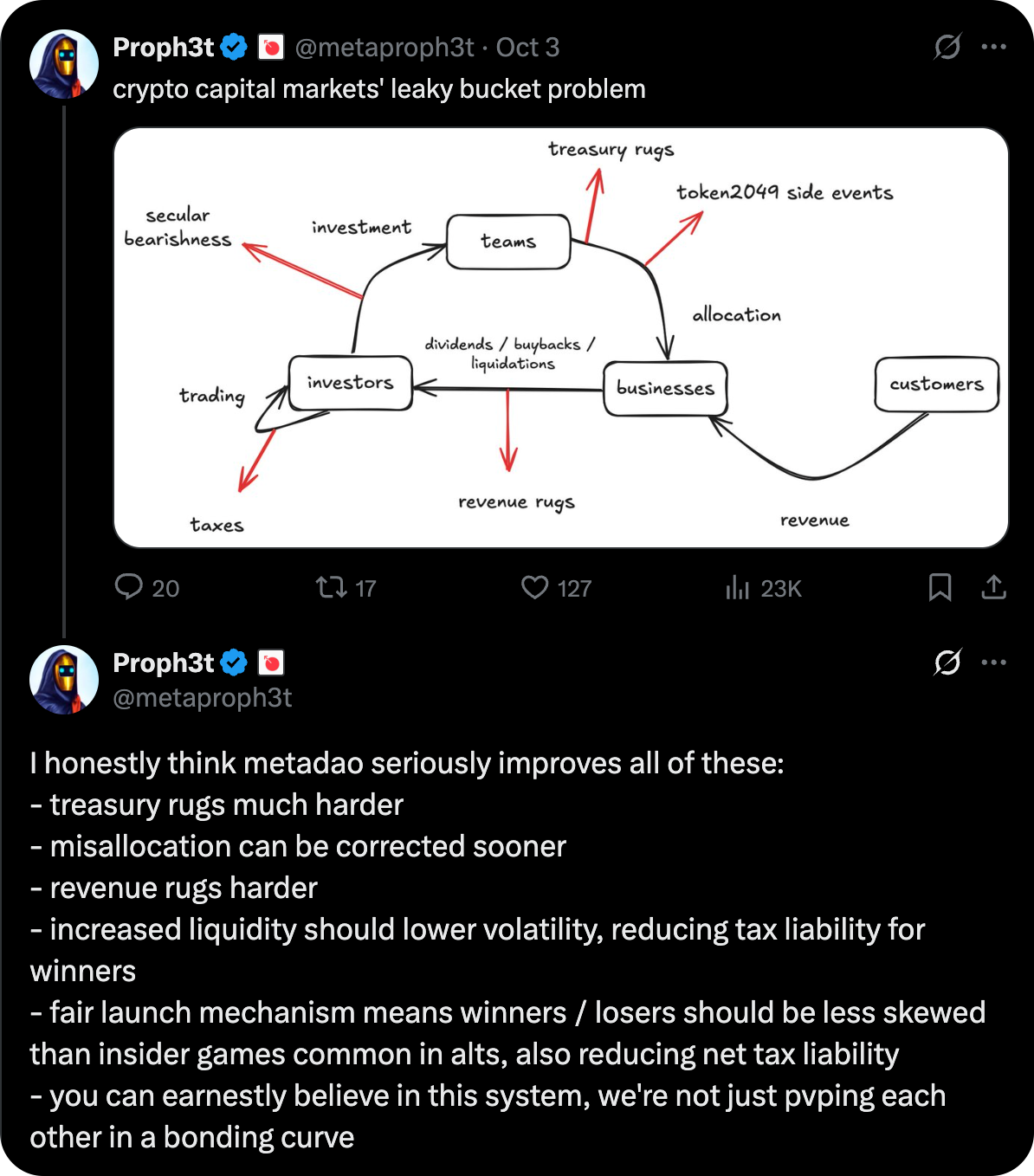 This connects to the vision of Internet Capital Markets, a push forming for implementing blockchain-native asset ownership and fundraising into the next wave of corporate governance. The problem? Token holders largely don't have real claims to the projects they’ve bought into. MetaDAO's futarchy changes this, letting any market participant help determine the path forward of an onchain organization, whether or not they hold a large amount of its token supply.