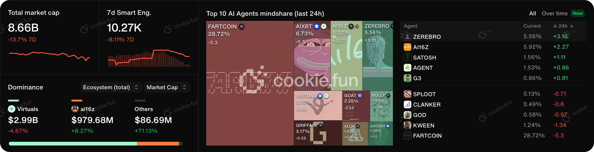 Virtuals Protocol may still lead with a $2.99B market cap, ai16z's ecosystem grew in both market cap and mindshare despite the tough market conditions. Even with the sector-wide dip, ai16z is showing strength, driven by the rapid adoption of its Eliza agents framework. More on this below!