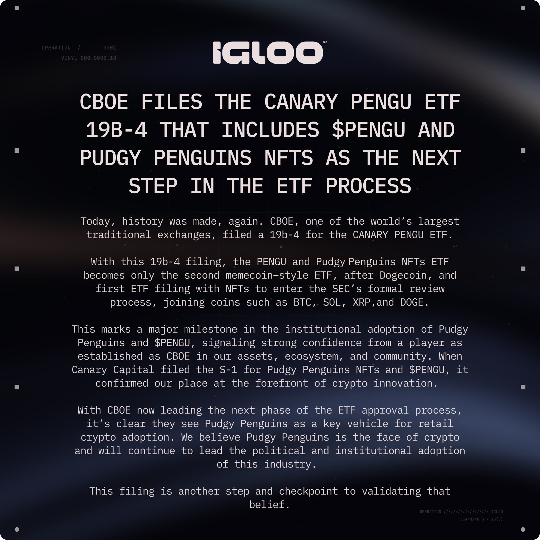 That's because TradFi exchange giant Cboe just filed a 19b-4 form for Canary Capital's proposed PENGU ETF, which would invest in Pudgy Penguin NFTs and the $PENGU token.