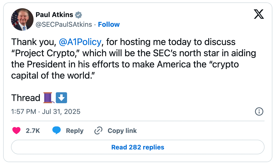 On Thursday, Securities and Exchange Commission (SEC) Chair Paul Atkins established “Project Crypto” as the agency’s north star to aid President Trump in establishing America as the “crypto capital of the world.”