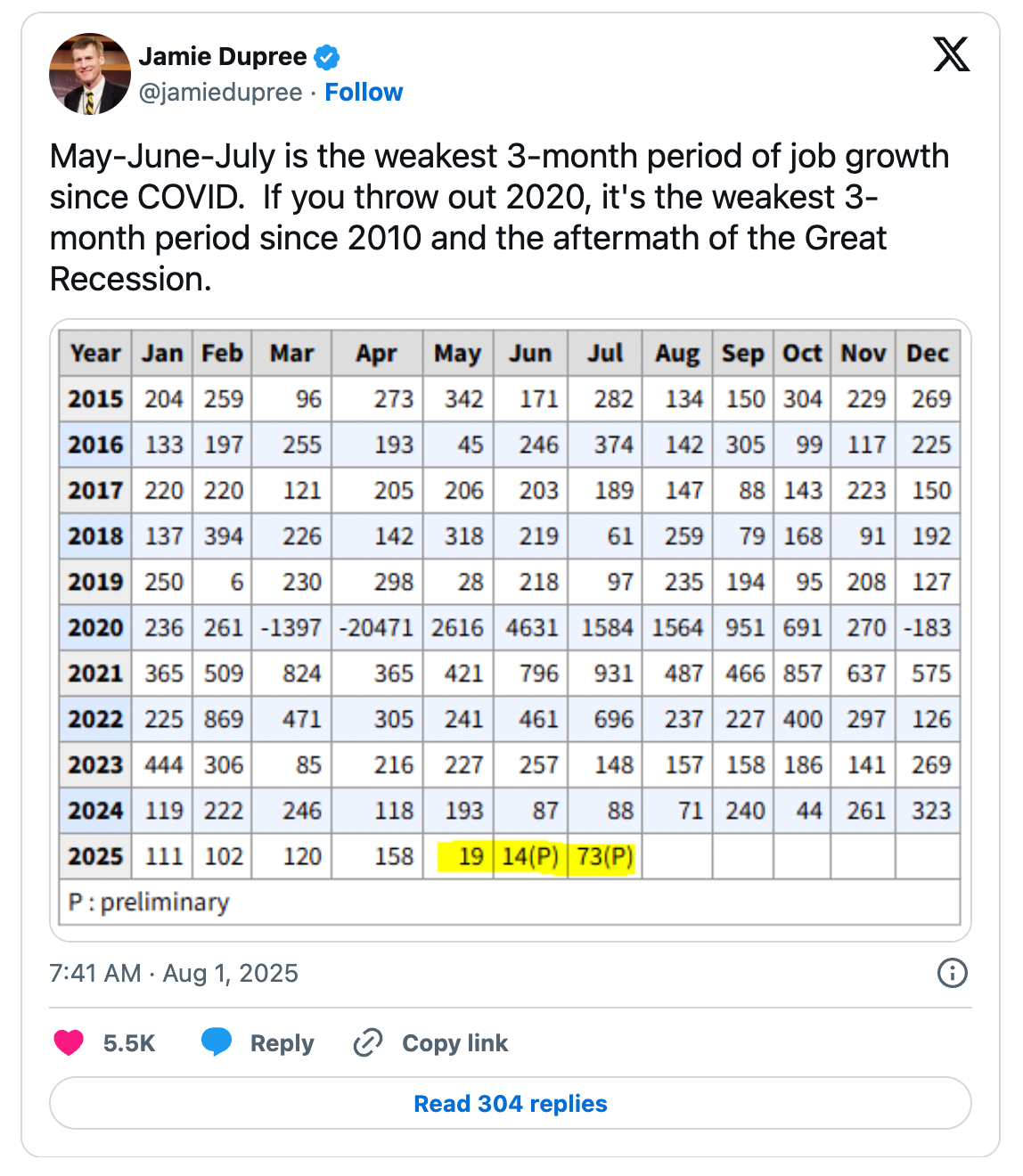 On Truth Social, President Trump subsequently rebuked Biden-era DOL Commissioner of Labor Statistics Dr. Erika McEntarfer, claiming labor data is being manipulated for political purposes and that his economy is “BOOMING.” Trump concluded his remarks by professing that Fed Chair Jerome Powell should be put “out to pasture.”
