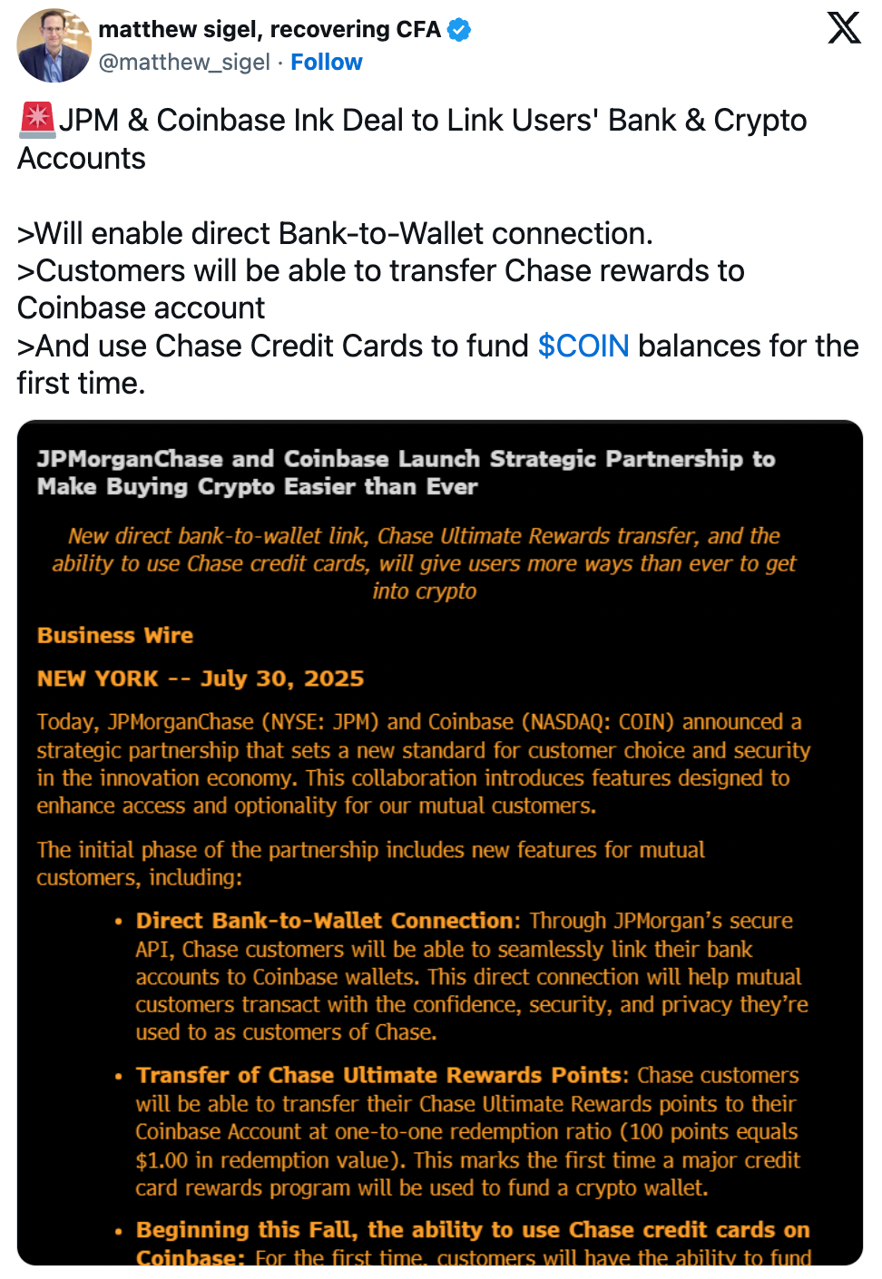 The initial phase of this partnership commences this fall and allows Coinbase users to fund their accounts with Chase credit cards. Beginning in 2026, Chase users can link bank accounts with Coinbase wallets through JP Morgan’s secure API and redeem 100 Chase credit card reward points for $1 of Coinbase spending power.