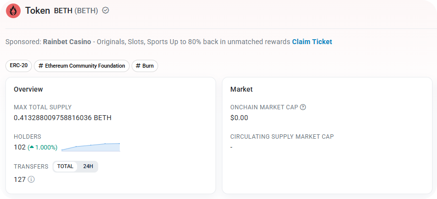 Created by Zak Cole of the Ethereum Community Foundation, BETH is an immutable ERC-20 token that represents ETH permanently destroyed at Ethereum's main 0x00...0000 burn address.