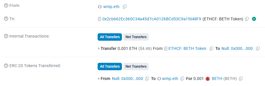 But trying is simple if you decide to. Just tee up an ETH send to the BETH contract address at 0x2cb662Ec360C34a45d7cA0126BCd53C9a1fd48F9 and confirm it with your wallet. You'll instantly receive back an equivalent amount of BETH, like so: