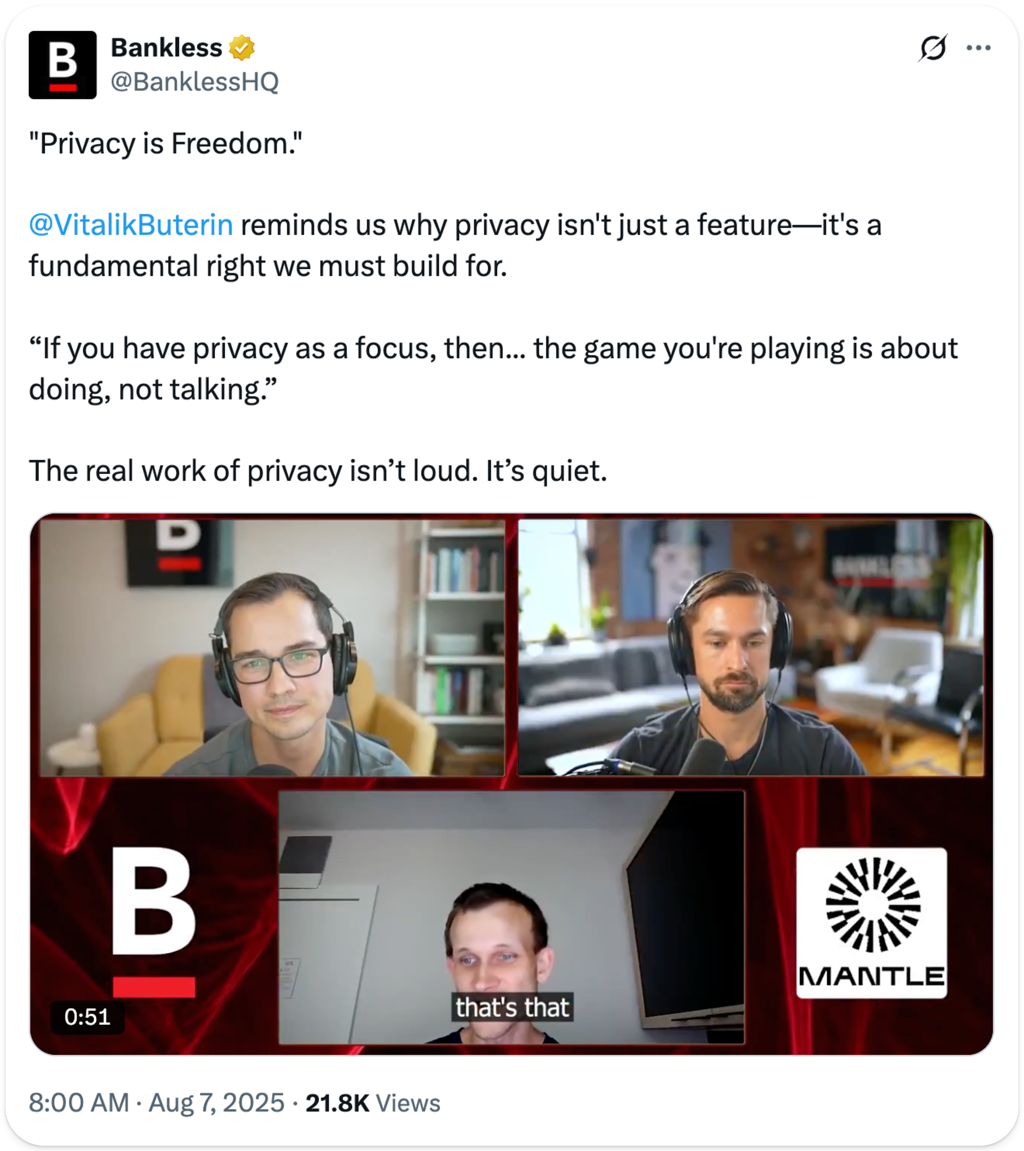 Decentralization was Ethereum’s first big bet, and privacy may very well be its next. Vitalik dedicated significant time in this episode to laying out an ambitious privacy roadmap that is deeply principled and pragmatic.