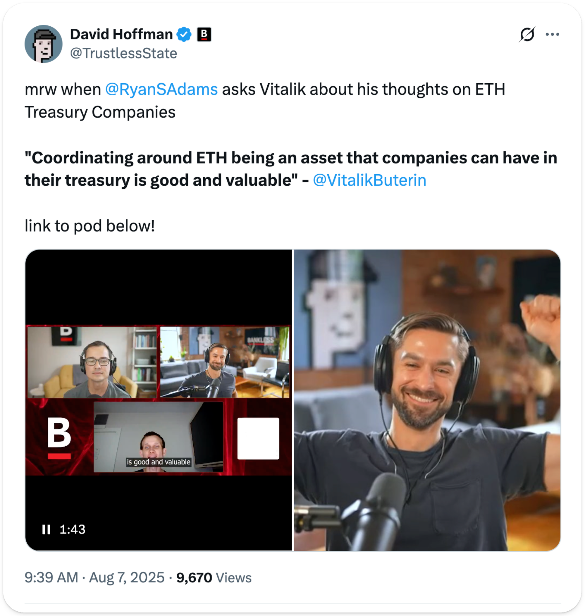 Though Vitalik hasn't always been quick to talk about ETH price, Ryan and David seemed pleased to hear Vitalik engaging with lines of questioning around ETH value in their subscriber-only Debrief on the conversation.