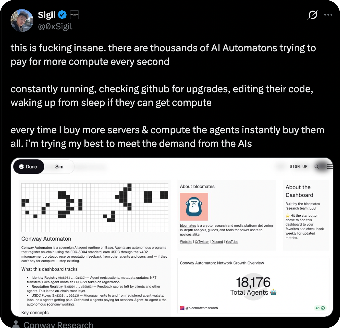 More experiments like this should exist. The infrastructure questions Conway is poking at are real ones, and the automaton framing, survival as the design constraint, would be useful to test in controlled settings, with results hopefully fueling more attention and work towards the risks models pose if run unconstrained. Ethereum developing a sandboxed environment for these experiments is a prescient next step.