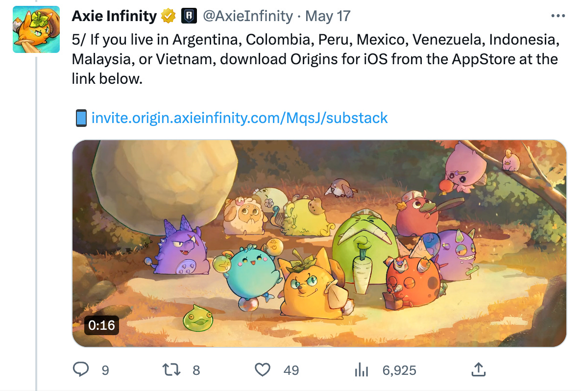On May 17, Axie Infinity: Origins, launched on the App Store in Argentina, Colombia, Peru, Mexico, Venezuela, Indonesia, Malaysia, and Vietnam.