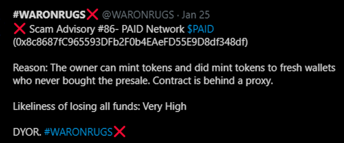 On March 5, the deployer wallet for $PAID transferred ownership to another (attacker) wallet, which subsequently minted $37M worth of the token. The attacker wallet then dumped these freshly minted tokens into the Uniswap Uniswap pool, instantly crashing the price. While the team argues that poor key management led to the loss, others counter that "mint" exploits generally boil down to inside jobs.