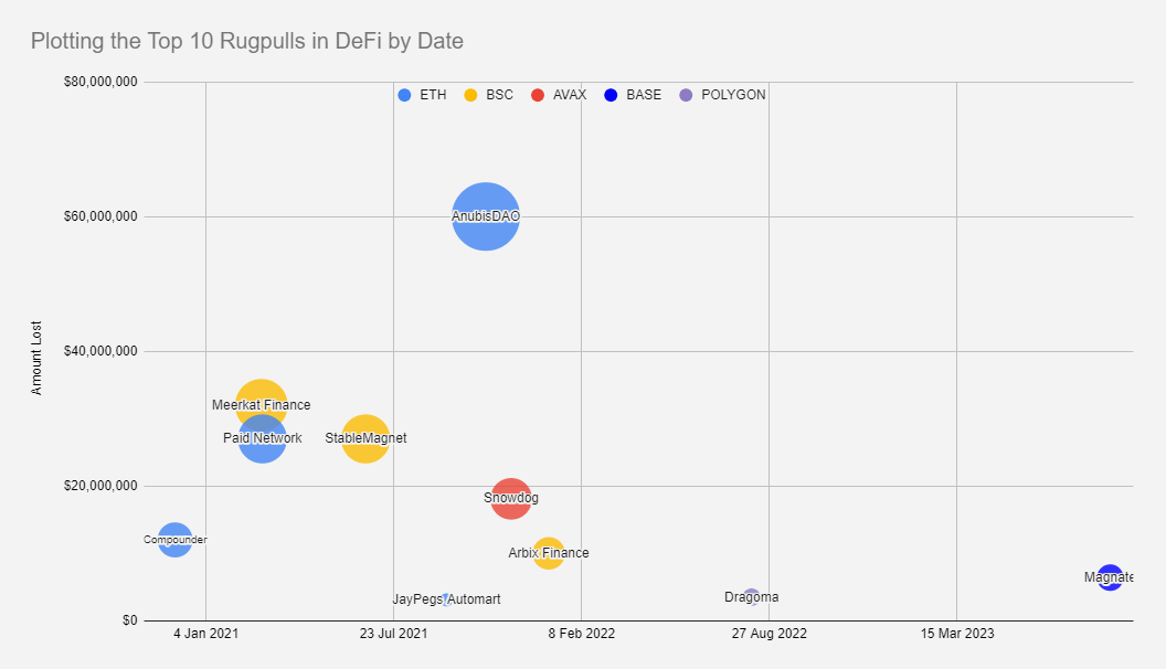 Let's start with some good news after that depressing data - of all rug pulls examined, the vast majority of funds were lost before 2022. In fact, about 84% of the funds in the Top 10 list were lost in just 2021, coming down from the highs of DeFi Summer.
