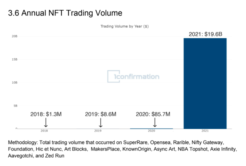 - Trading volume around NFTs passed $19.6B in 2021.