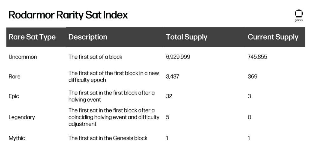 Central to understanding Rare Sats is the Rodarmor Rarity Index, named after Casey Rodarmor, the creator of Ordinals. This index classifies satoshis into various categories based on their uniqueness and rarity. The categories range from the most common, which form the bulk of Bitcoin's supply, to the mythic, which includes the first-ever satoshi mined in Bitcoin's genesis block.