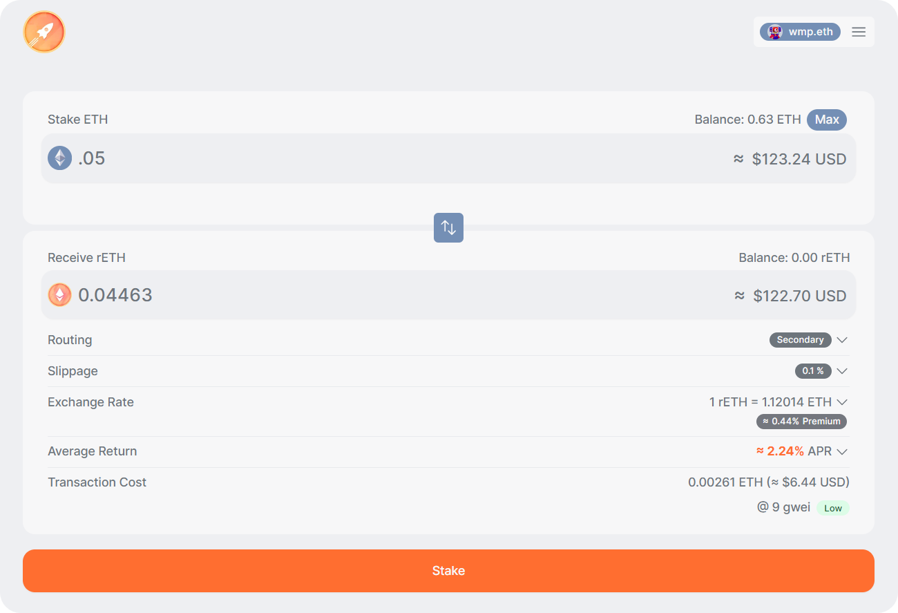 - 🙌 Receive rETH: Once the transaction is confirmed, you'll receive the appropriate amount of rETH tokens in your wallet. Remember, the ETH / rETH exchange rate is dynamic, so currently 1 ETH will fetch you ~0.89 rETH. These tokens represent your staked ETH and the rewards they earn.