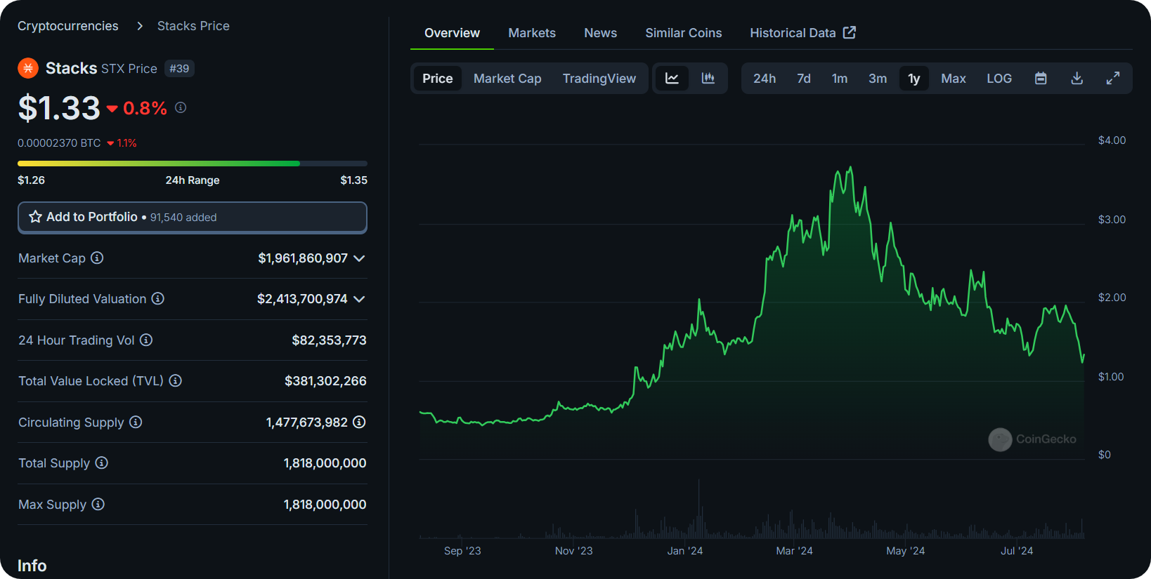 At the time of this guide's latest update, STX was trading around $1.33 per token with a market capitalization of approximately $1.96 billion.