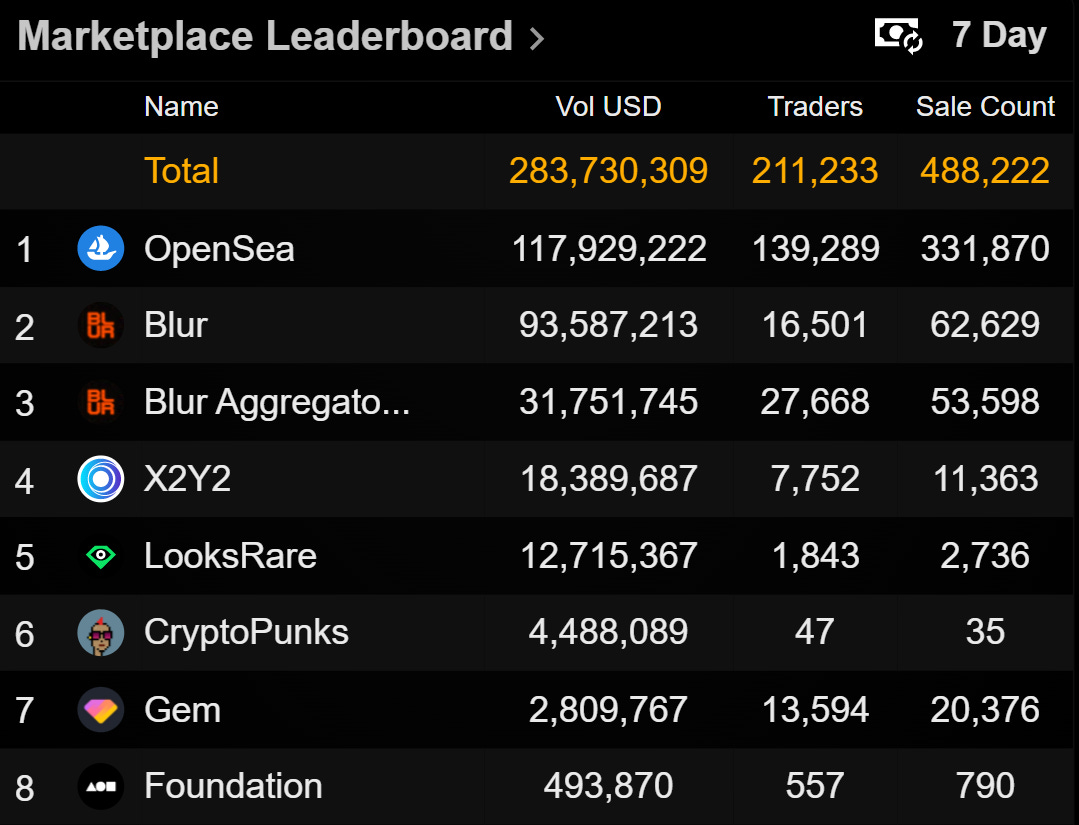 With the $BLUR airdrop now just days away, OpenSea OpenSea and Blur Blur continue to be neck and neck in the NFT trading volume wars. As the airdrop dust settles, all eyes will be on who can take a decisive lead once more. The rest of the standings look unchanged since last week with the exception of cryptoart platform Foundation, which just edged out Sudoswap to move into 8th place.