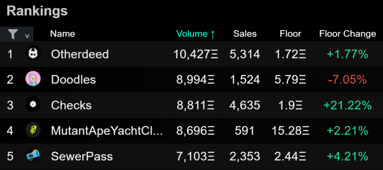 It’s been another dominant volume week for Yuga Labs projects, no surprise there. And Jack Butcher’s Checks have also continued to rip, further cementing the collection’s place as one of the biggest NFT stories so far in 2023. A project that we haven’t seen in the top 5 recently that just had a strong showing was Doodles, which is riding high on fresh Dooplicators buzz.