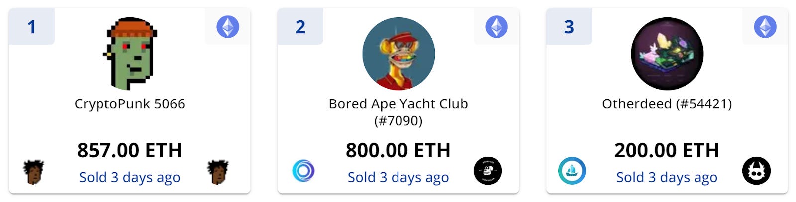 In last week’s recap, I noted how the three big NFT buys of that week collectively amounted to over Ξ1,160 worth of sales. Fast forward to today, and the biggest NFT buys of this week collectively amounted to nearly Ξ2,000! These huge transactions are just the latest indications that things are heating up at the top of the NFT economy right now.