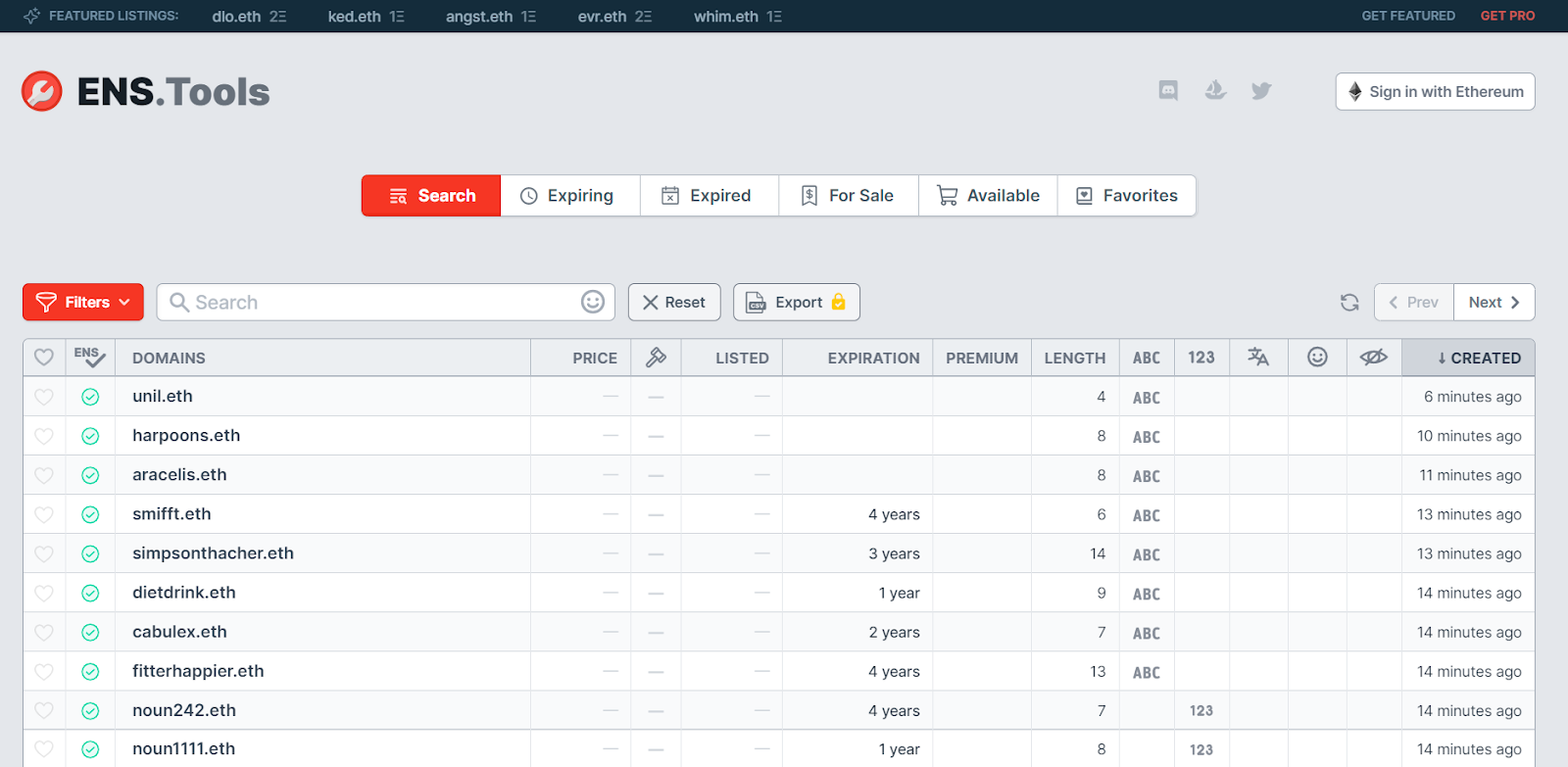 As for ENS.Tools, the platform provides a one-stop dashboard for searching through ENS domains via “Expiring,” “Expired,” “For Sale,” and “Available” filters.