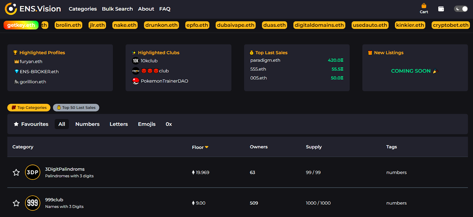 What makes ENS Vision useful is that it offers Bulk Search and Bulk Registration features. The site’s team has noted that the latter functionality can save users up to ~30% on their gas costs compared to registrations via the ENS dapp proper. ENS Vision also makes it easy to track trading activity and floor prices across specific ENS categories, e.g. three-digit domains.