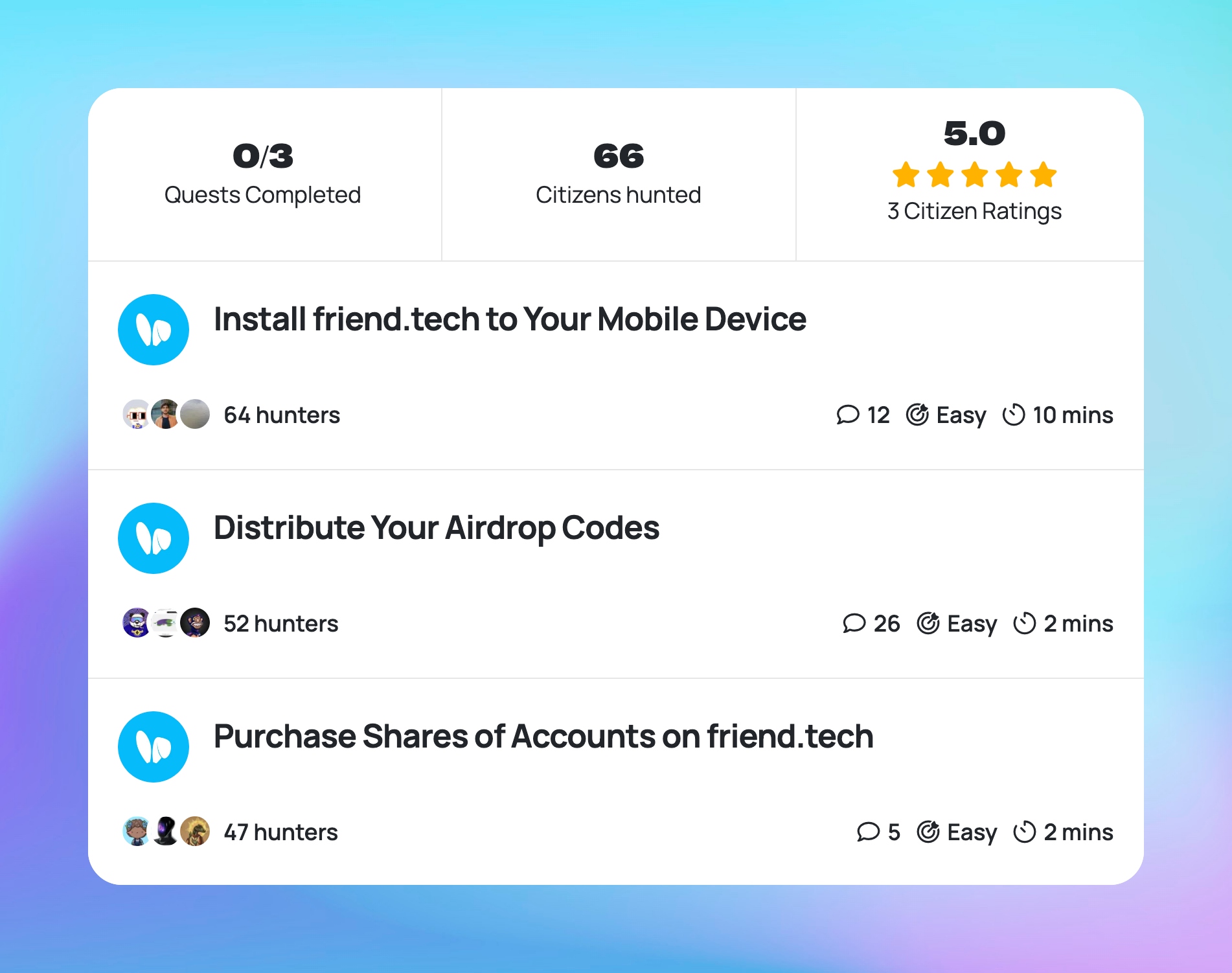 Alright, so now you've got some fresh ETH loaded into your friend.tech wallet, what do you do with it? Get started placing your bets and buying shares of accounts! You can dig into the 3 listed Quests by becoming a paying subscriber and checking out the full page on Airdrop Hunter 😎