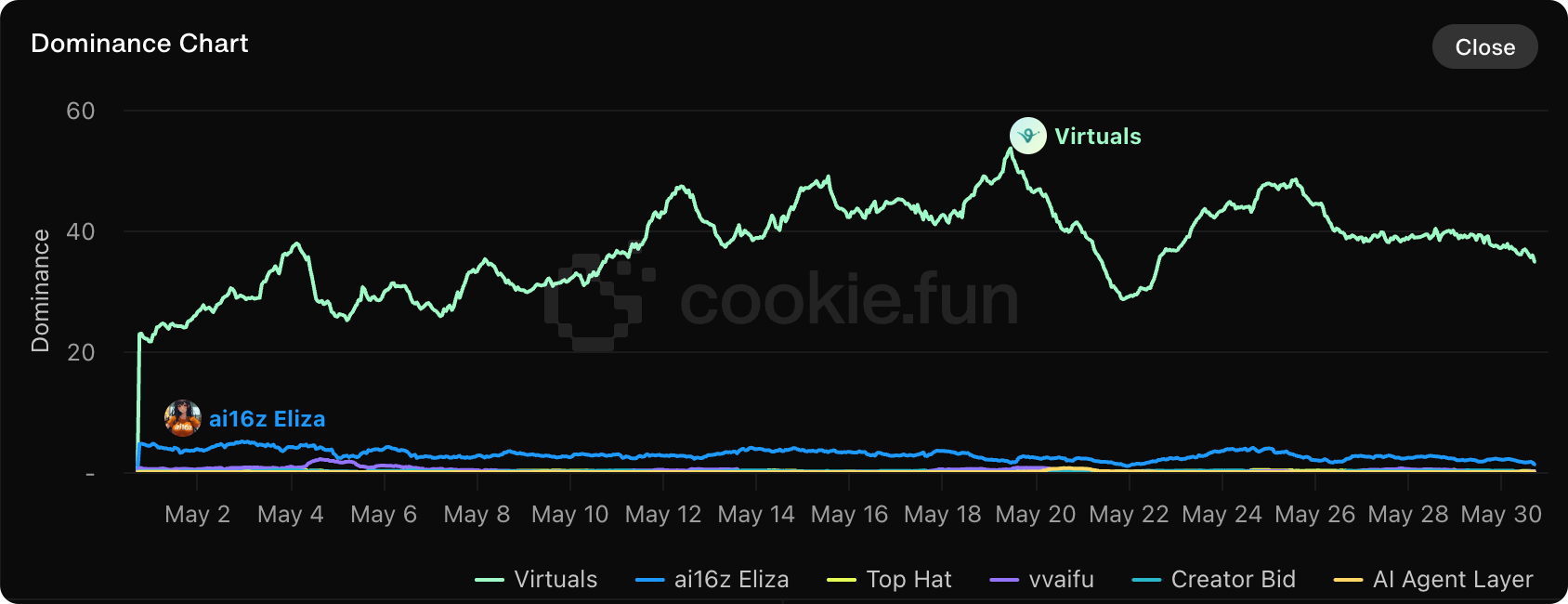 Despite the retreat here, Virtuals showed impressive resilience, dropping only ~5% while still up 50% on the month. The relative strength isn't surprising given its constant stream of ecosystem updates and launches that keep pushing the platform forward.