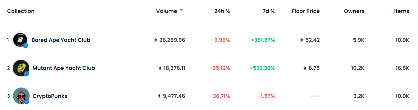 • The BAYC and MAYC collections dominated the NFT ecosystem’s volume charts this week ...