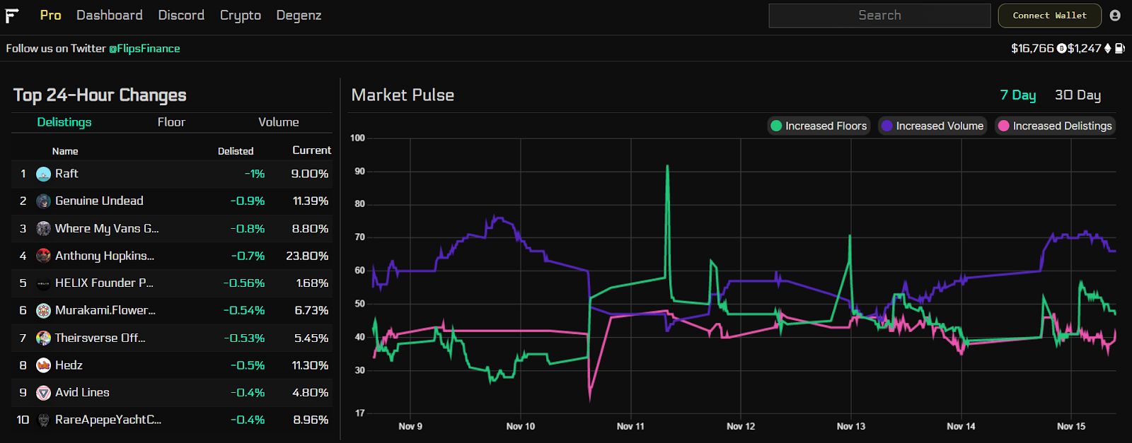 - Comparing 24 Hour, 7 Day, and 30 Day floor price stats for major collections on Flips