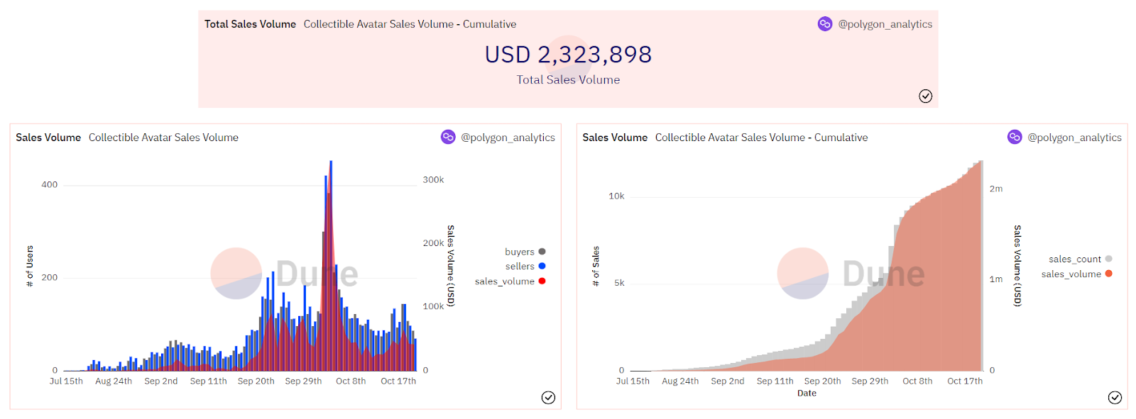At the time of this post’s writing, the collective trading activity around all of the initial series amounted to over $2.3M USD worth of sales volume across +12,000 unique sales so far.