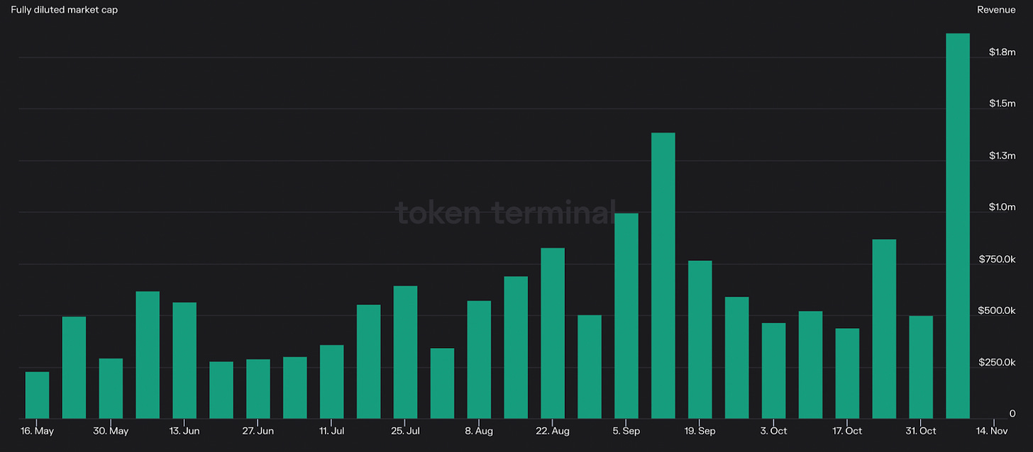 The price of GMX has increased 4.8% against USD and 41.2% in the past week. This outperformance, along with the governance tokens of other perpetuals DEXs such as dYdX dYdX (DYDX) and Gains Network (GNS), can likely be attributed to the collapse of FTX, as investors may expect perps trading volume to move to DEXs. The move may also be due in part to an increase in trading activity on GMX amidst volatility in the market, as the exchange posted record high weekly volume and revenue numbers of $5.0B and $1.9M respectively.