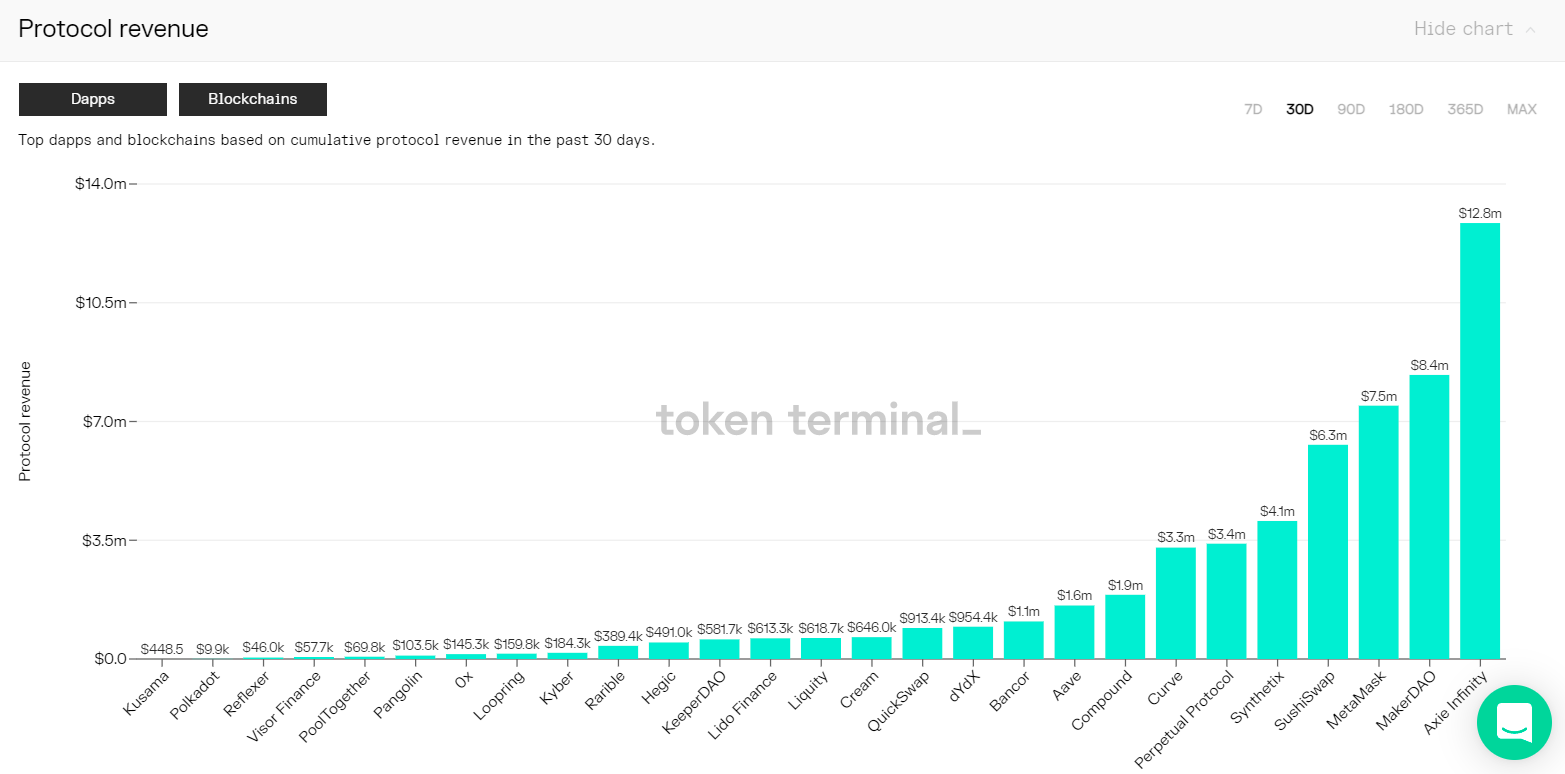 • Per Token Terminal, Axie Infinity has generated nearly $13 million worth of protocol revenues over the past 30 days. That’s far above top DeFi projects Maker ($8.4M), Sushi Sushi ($6.3M), and Synthetix Synthetix ($4.1M) in the same span!