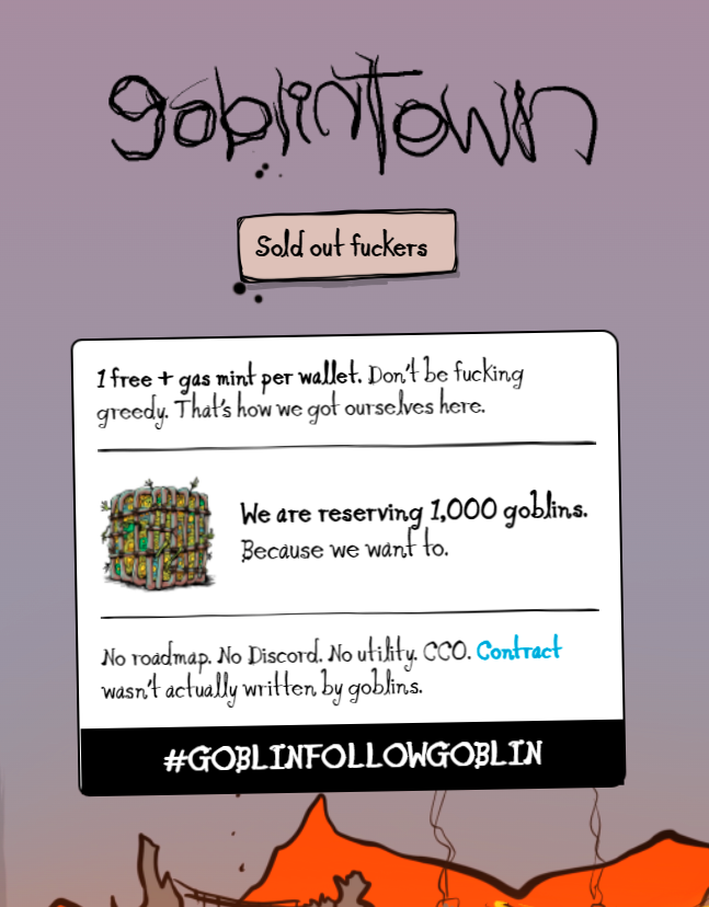To be sure, the NFTs look scary, but the art itself is of a high-quality style. So too is the project’s smart contract well fashioned, as was the goblintown.wtf website. The project’s crypto-savvy dadaist approach to social media also suggests the creators are zany NFT veterans rather than novices.