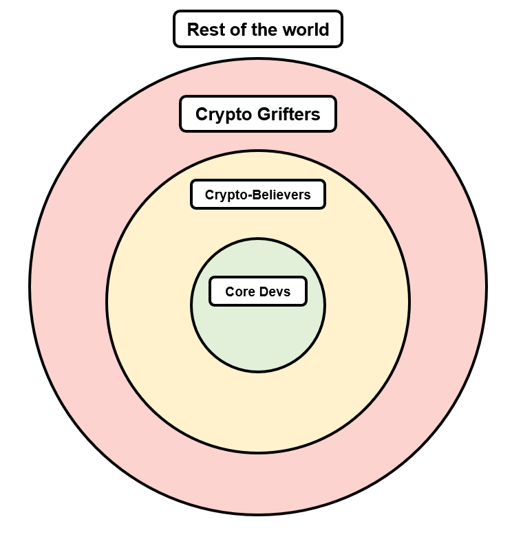 The Core Devs at the center, the rest of world on the outside, with the Crypto Believers, and Grifters in the middle.