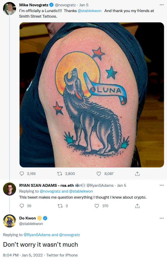 When Mike Novogratz, CEO of Galaxy got a Terra Luna tattoo on his arm, Ryan replied on Twitter and said “This makes me question everything I know about crypto”, to which Do Kwon snarkily responded “Don’t worry, it wasn’t much