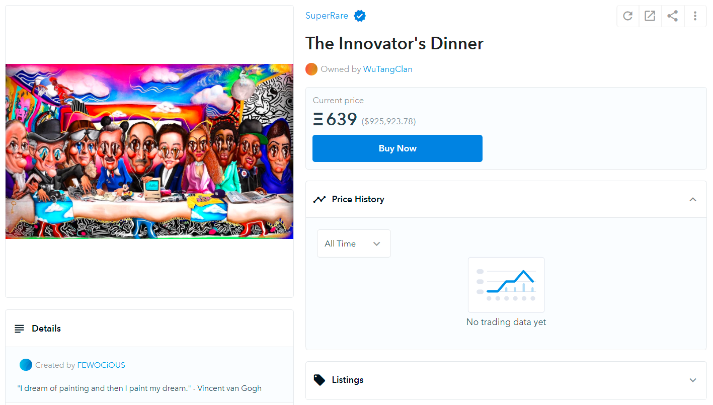 The standing bid on FEWOCiOUS’s SuperRare piece The Innovator’s Dinner is 639 ETH ...